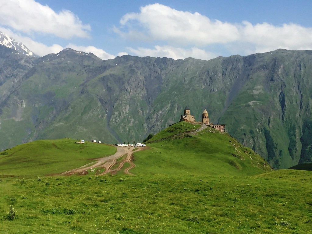 In July I traveled to the Republic of Georgia (საქართველო). One of the trip highlights was visiting the Gergeti Trinity Church (წმინდა სამება) near Mt. Kazbegi (close to the border with Russia). It was a stunning church in the midst of gorgeous mountains.