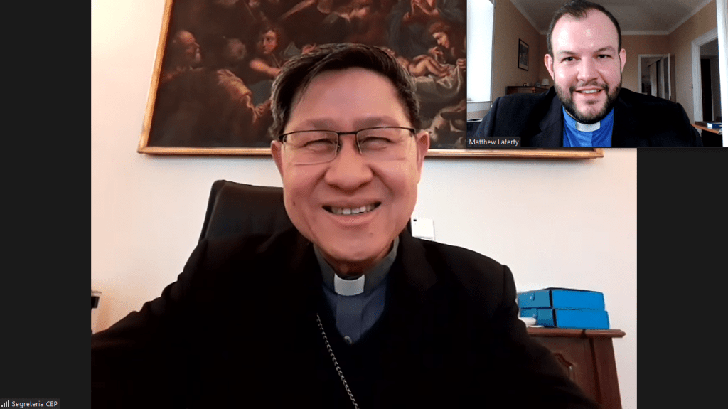 The Reverend Matthew A. Laferty, director of the Methodist Ecumenical Office Rome, met His Eminence Cardinal Luis Antonio Tagle, prefect for the Congregation for the Evangelization for Peoples, on 16 March 2021. They discussed a wide array of topics related to mission and evangelism. Cardinal Tagle oversees the Catholic Church’s international relief and development organization ‘Caritas Internationalis’, Pontifical mission societies, and Catholic mission areas (predominately located in Africa, Asia, and Oceania). Cardinal Tagle and Rev. Laferty spoke about a need for an ecumenical witness in mission, the 400th anniversary of Cardinal Tagle’s Vatican department, Methodist understandings of mission, and ways Methodists and Catholics globally can support minority Christian communities who suffer persecution.
