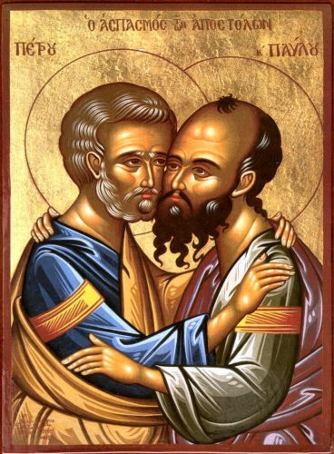 The Feast of Peter and Paul on June 29th is a major affair here in Rome. Both Peter and Paul were martyred in Rome, and their tombs remain to this day important pilgrimage sites. Many representations and icons of the two saints exist, but the Eastern Orthodox icon of Peter and Paul meeting and holding each other in embrace remains for me the most powerful. In Rome this icon of the two saints in embrace is an important symbol for the ecumenical movement and holds a prominent place of viewing in the Pontifical Council for Promoting Christian Unity, the Vatican’s ecumenical department. The icon reflects the deep longing and love for one another and the reconciliation with God and each other found through Christ; it too reminds us that as contemporary followers of Jesus Christ that each of us embodies both elements of Peter and Paul in our lives.
