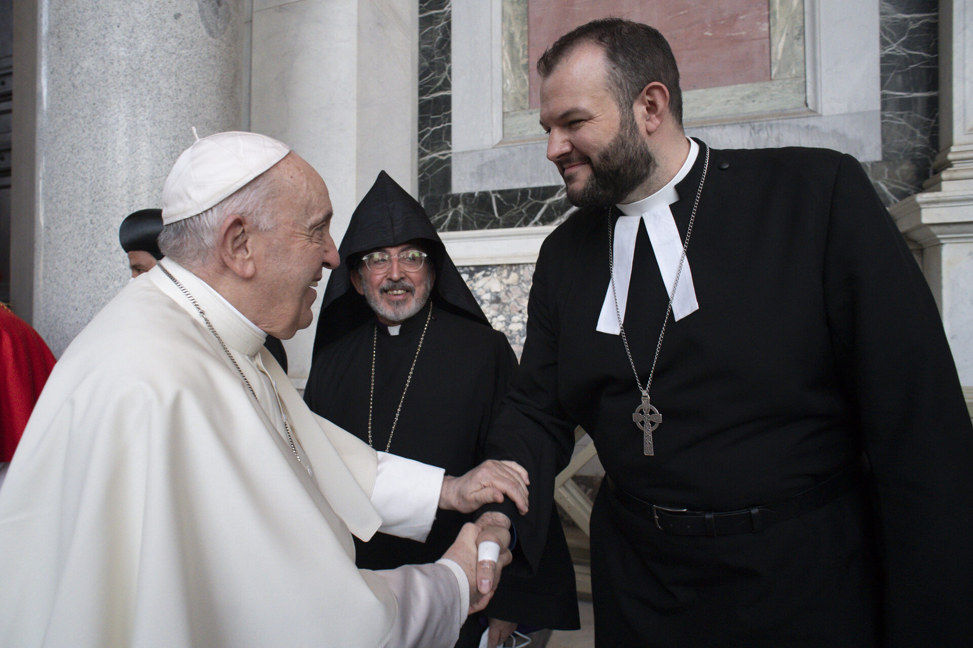 The Rev. Matthew A. Laferty, director of the Methodist Ecumenical Office Rome, greets Pope Francis at the Basilica of St. Paul’s-Outside-the Walls in Rome for Papal Vespers at the close of the Week of Prayer for Christian Unity on 25 January 2022.