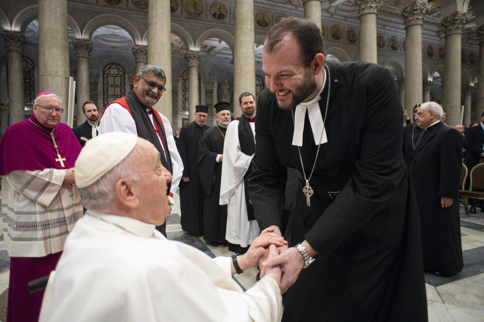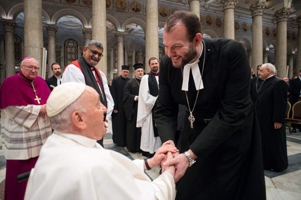 Pope Francis greeting Rev. Matthew Laferty on 25 January 2023 at the Papal Basilica of St. Pauls Outside of the Walls in Rome at the conclusion of Papal Vespers for the Feast of the Conversion of the St. Paul the Apostle and the end of the Week of Prayer for Christian Unity. Photo (c) Vatican Media.