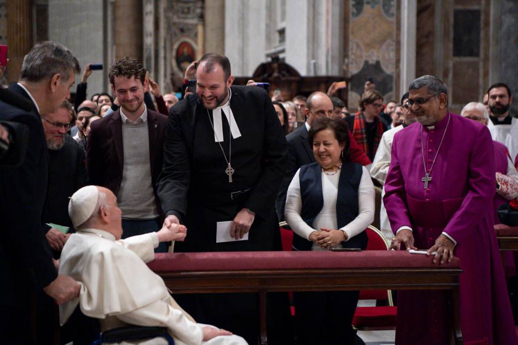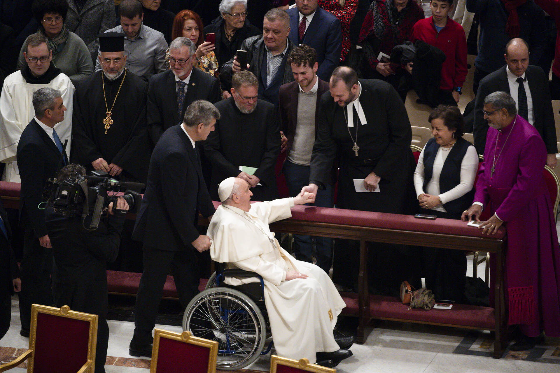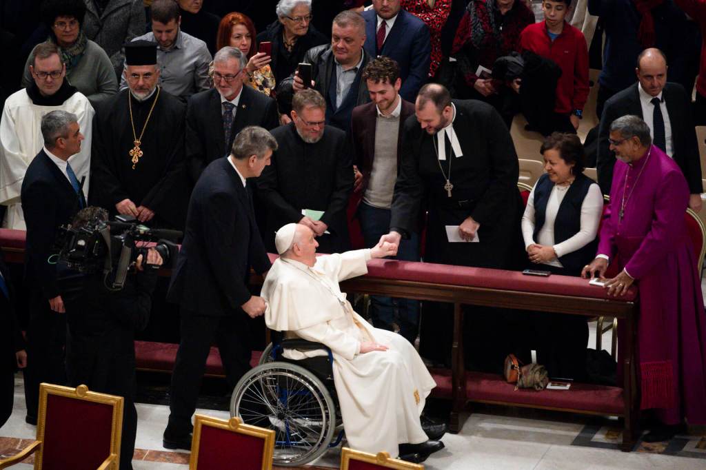 Pope Francis greets Matthew A. Laferty before the Christmas Eve Vigil on 24 Christmas 2023 at St. Peter’s Basilica in the Vatican City State. Photos (c) Vatican Media.